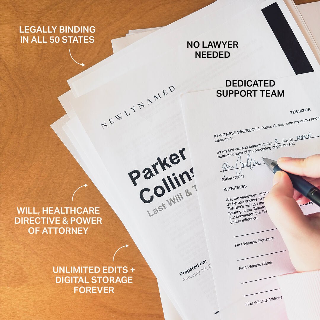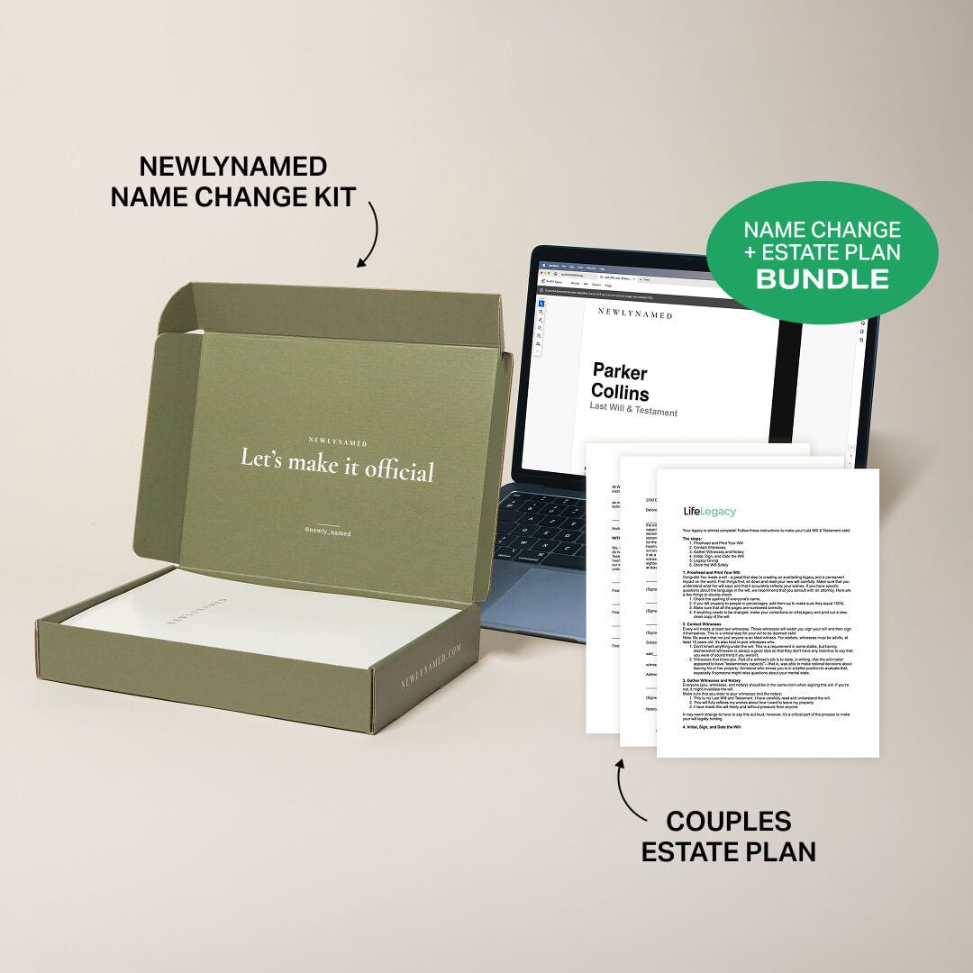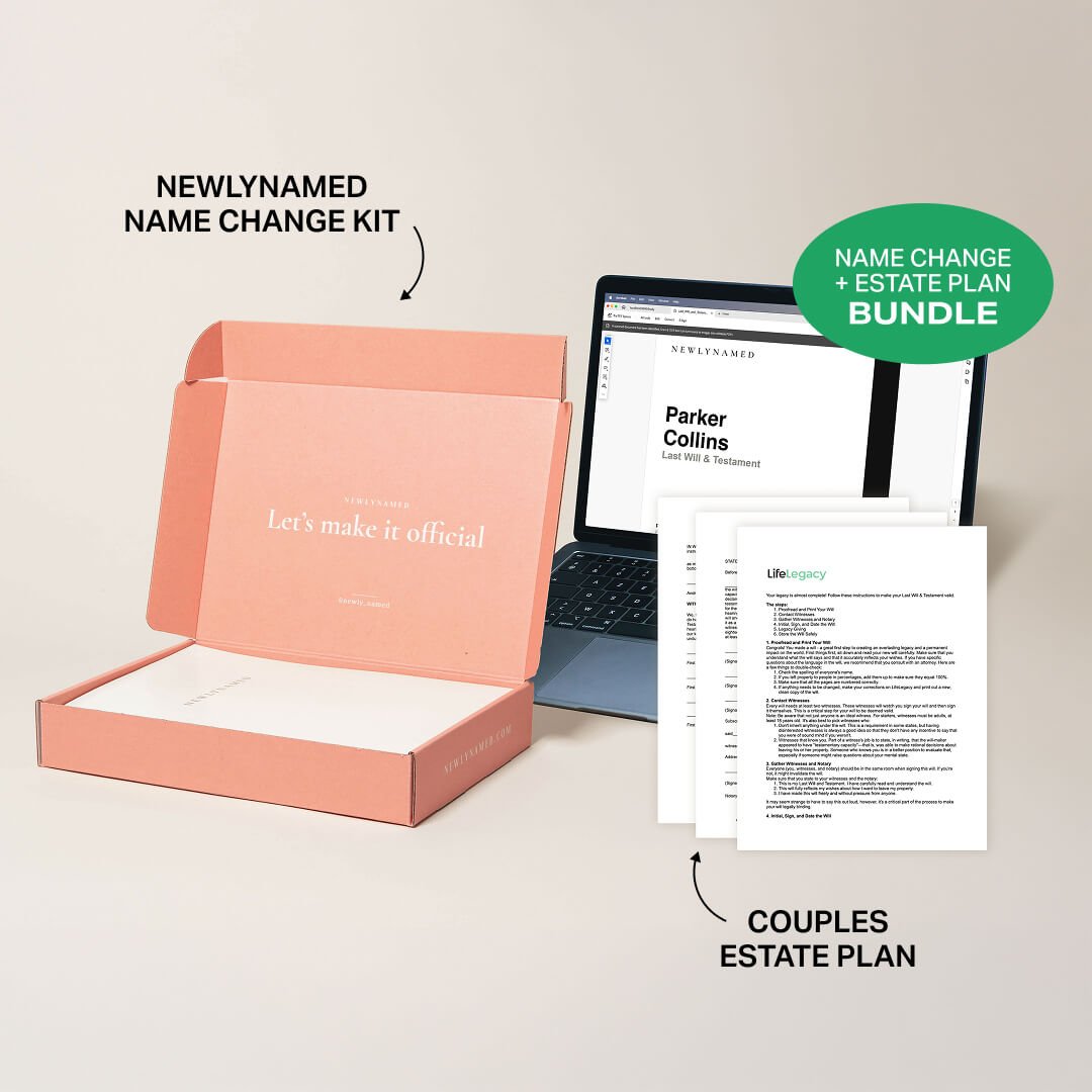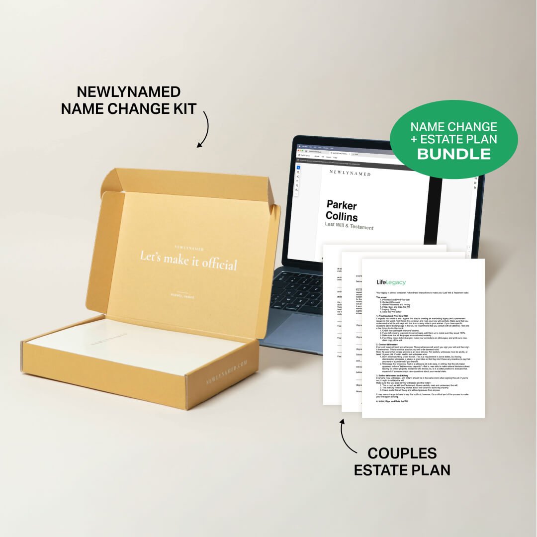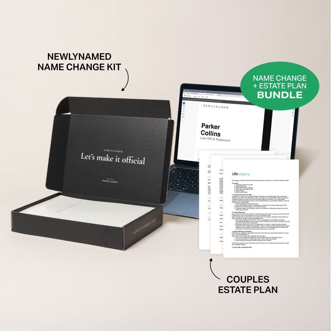 NewlyNamed Box + Couples Estate Plan: Best value if you want to handle your name change AND set up your estate plan (wills, healthcare directives, power of attorney) as a couple — all at once.